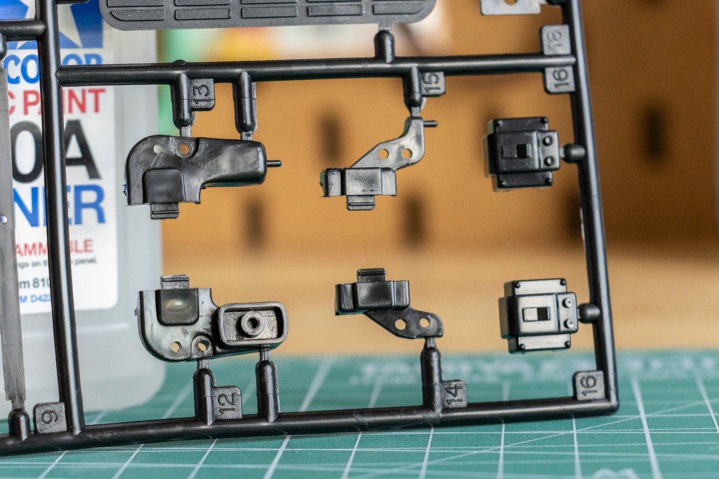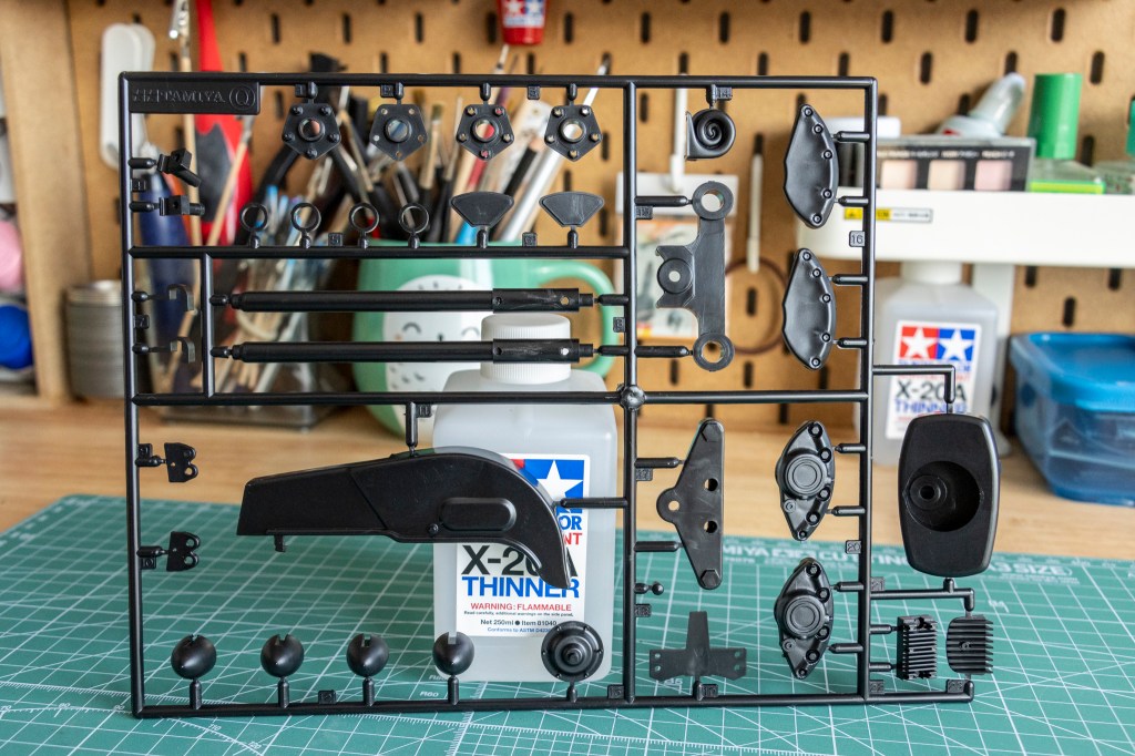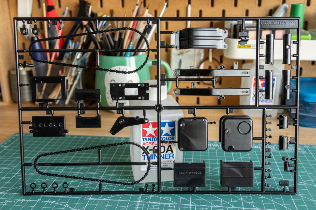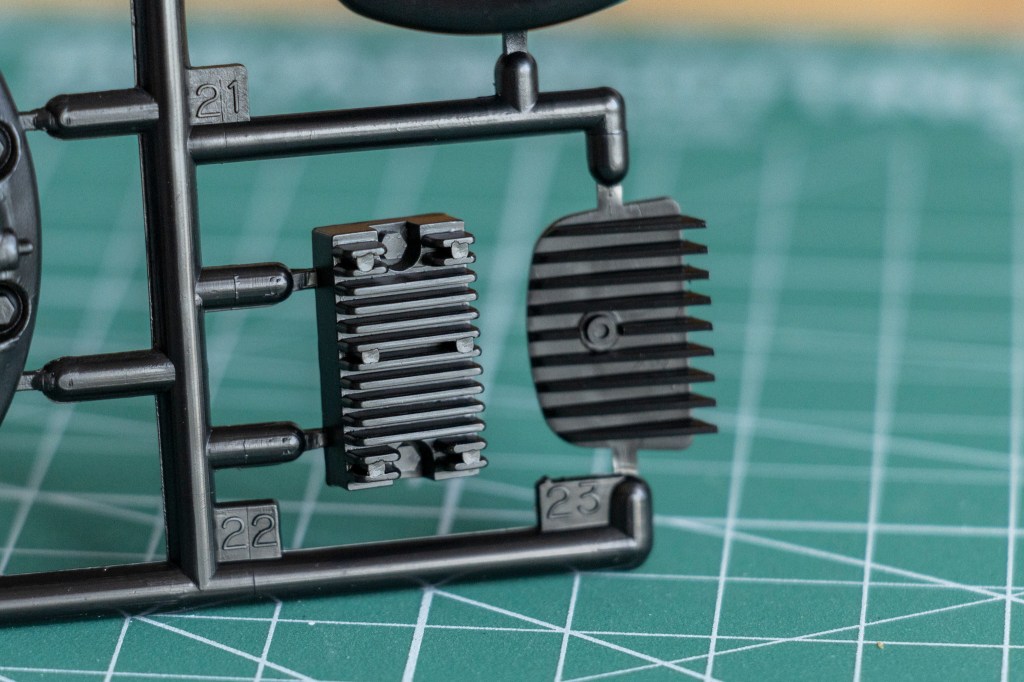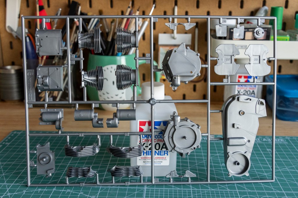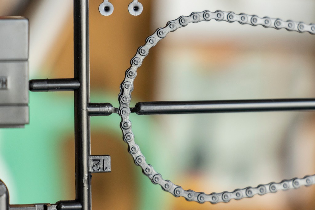 See the size comparison between the chains and the X-20A thinner? Crazy… You will find them on sprue C. Thank god the chain wheels are separated from the chains – quite a few 1/6 motorcycle models from Tamiya are designed the other way. So much easier to paint.