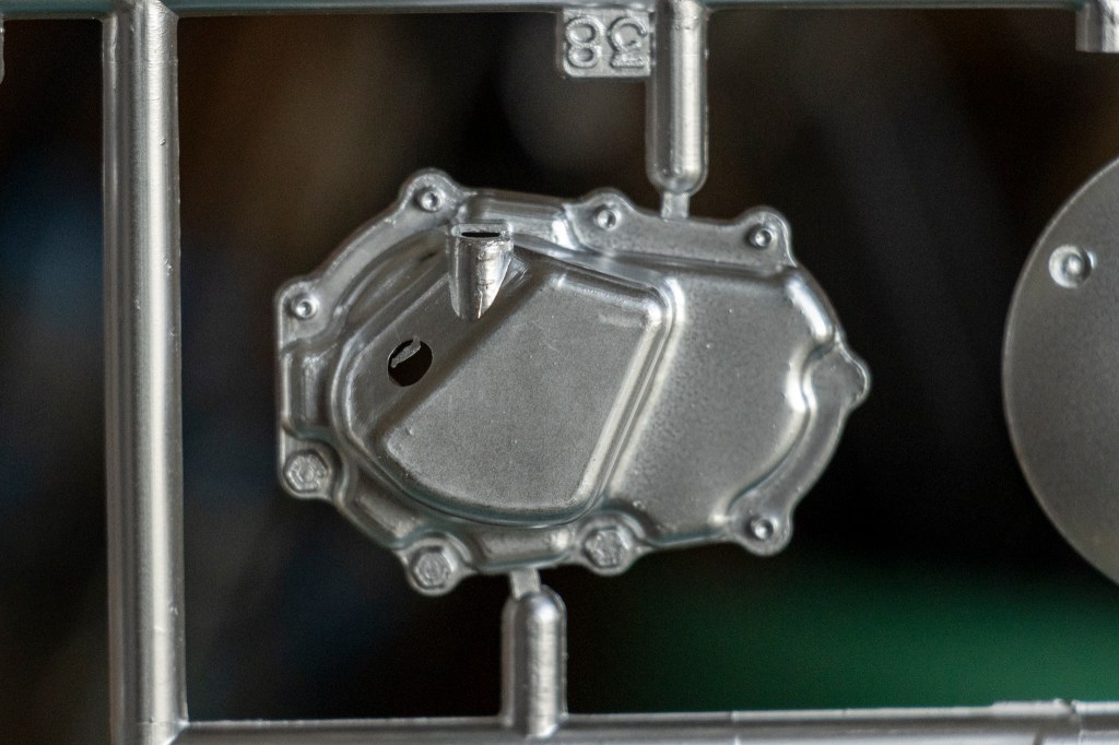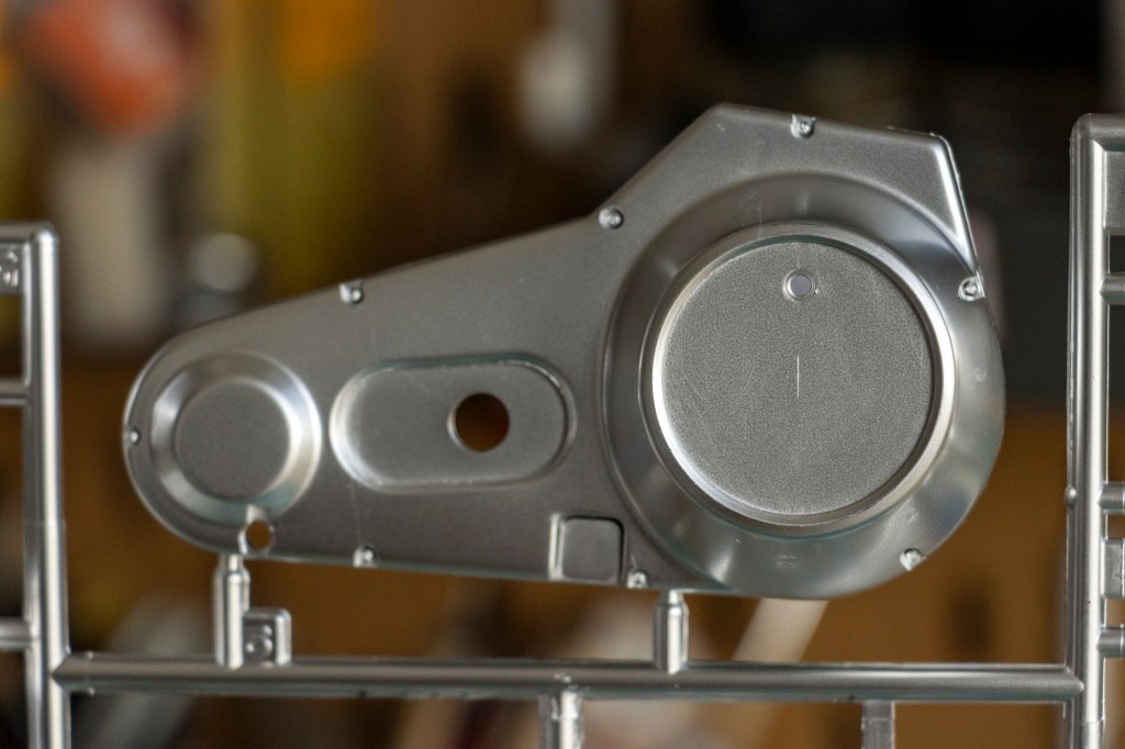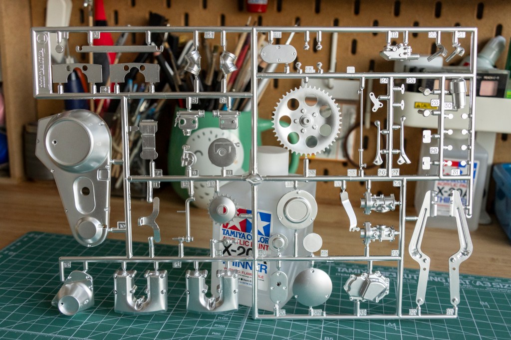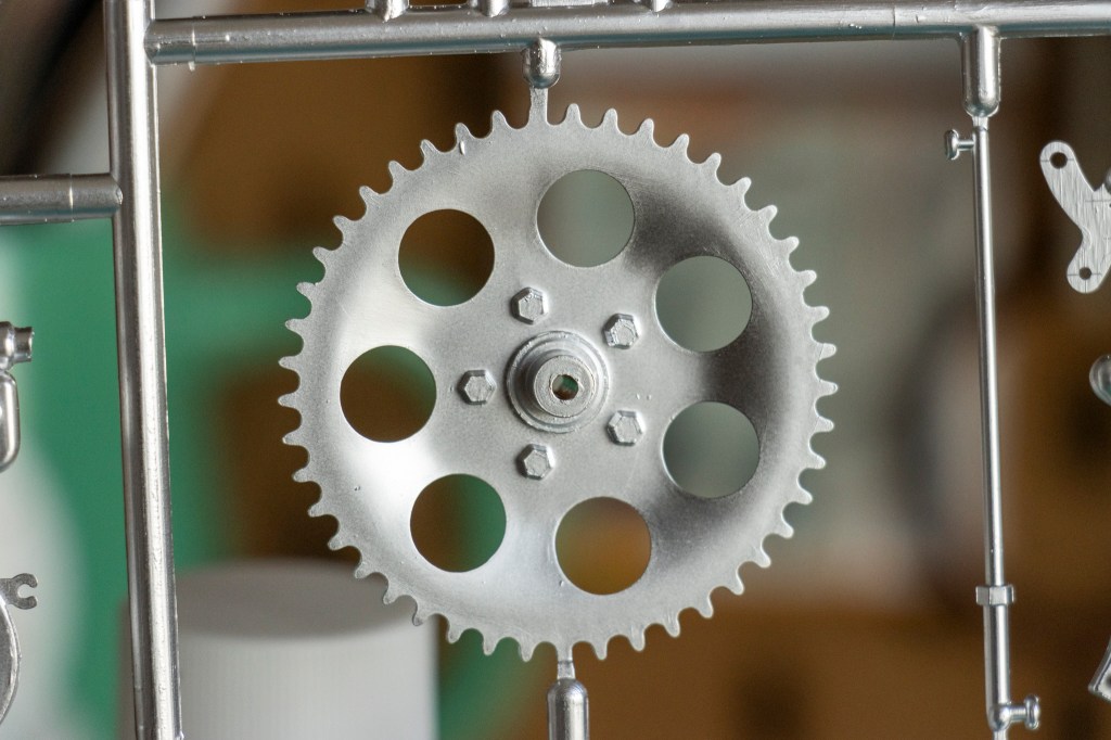 Finally, let’s take a look at those gun metal/silver mechanical parts on sprue E! Again, the size of that primary chain case!