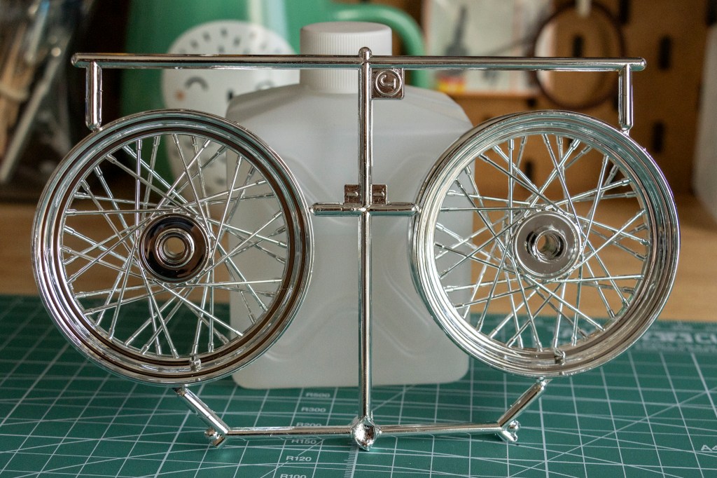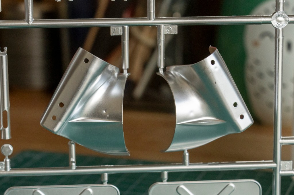 Yet another chrome-plated sprue, sprue P! The two front fork covers are packed separately, which I believe, protects the surface chrome.