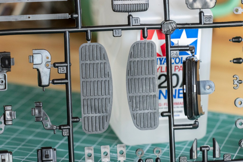 Chrome paint on parts, such as this gear shift level and all these nuts, will be removed and airbrushed with AK extreme metal paints.