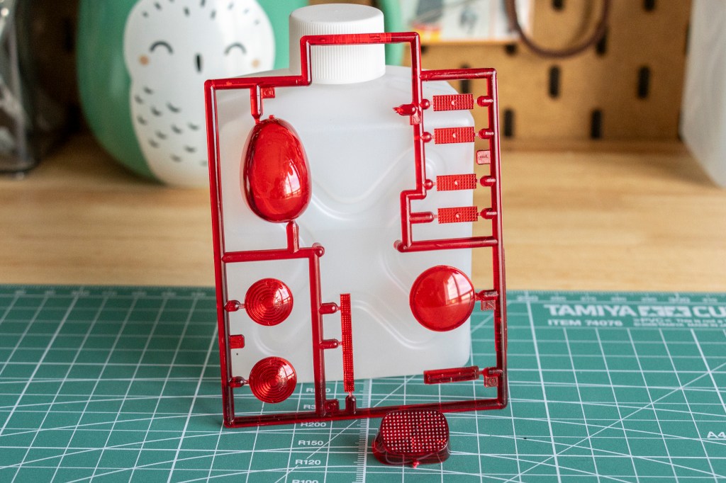 A small piece of yellow (more like orange to me) clear sprue covers the 4 blinker lamps and 3 reflectors.