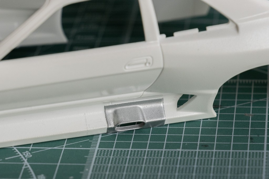 Some of the details must be masked and painted on the body, like the exhaust opening found on the passenger’s side. Here’s an example I did some years ago, using Tamiya’s TS-17 Gloss Aluminum paint. Overall, not a particularly challenging step (of course, you can paint it after polishing; otherwise, it must be masked again during clear-coating).