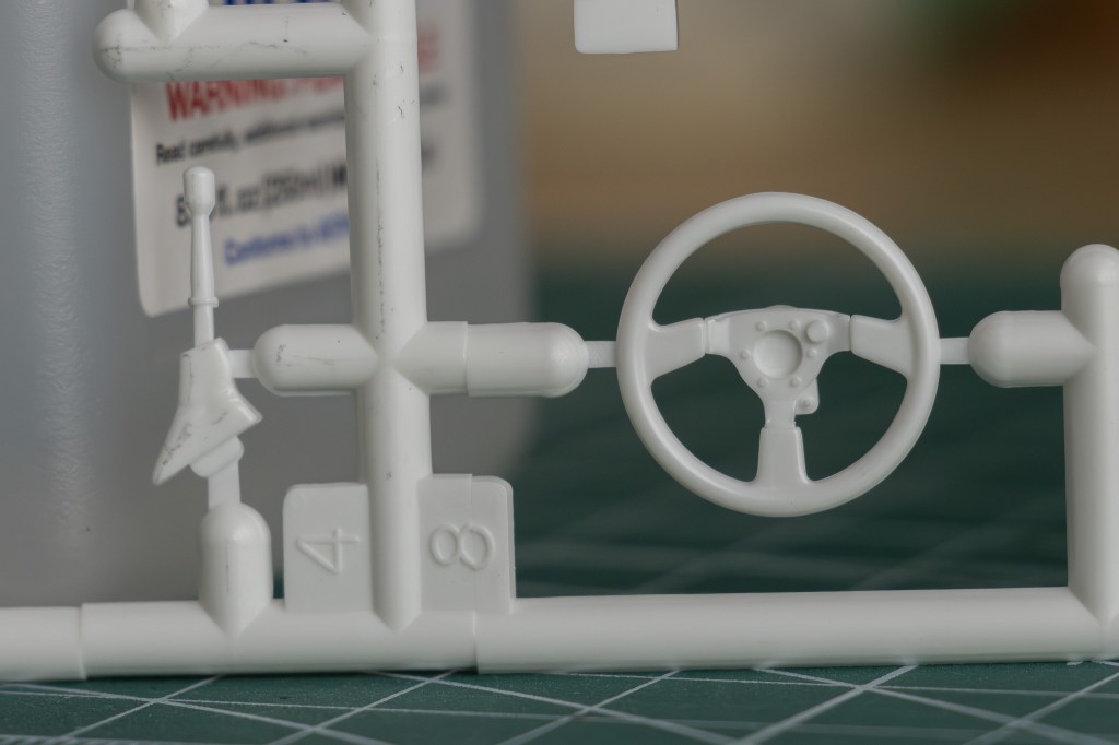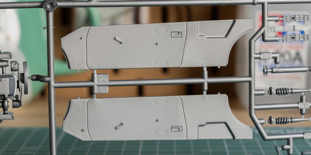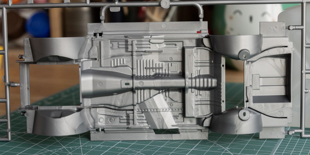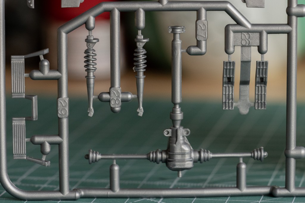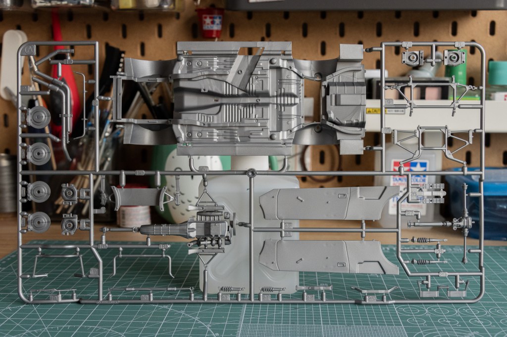 By now, you must have noticed that the bonnet is not movable. However, the chassis provided is fairly detailed, especially from the bottom-up view. Here, you can find half of the powertrain on sprue A.