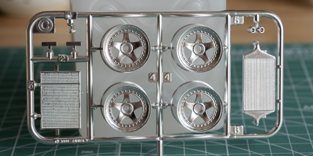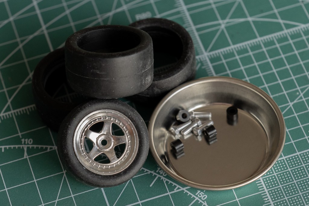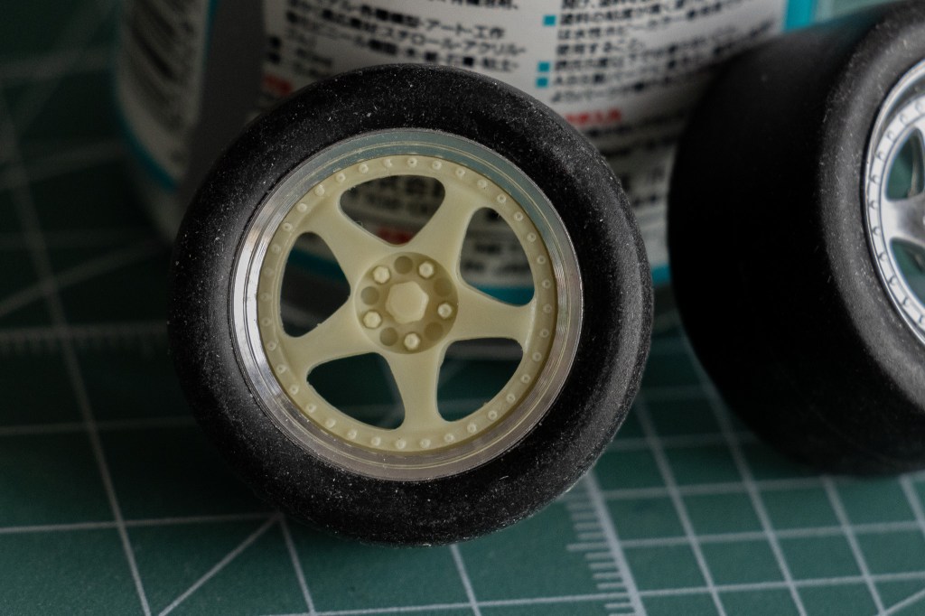 Nothing much to say about the tires. Tamiya provided 4 rivets to secure the wheels on the car, which I would call, uncommon.