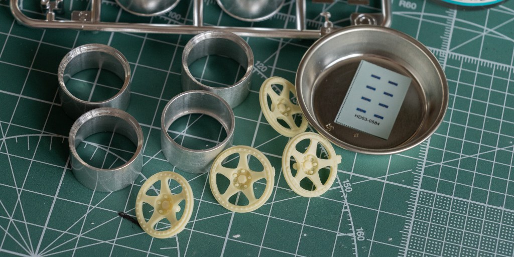 Metal and resin combination. This design greatly helps with the painting job later. The Nismo decal and air valves are also included.