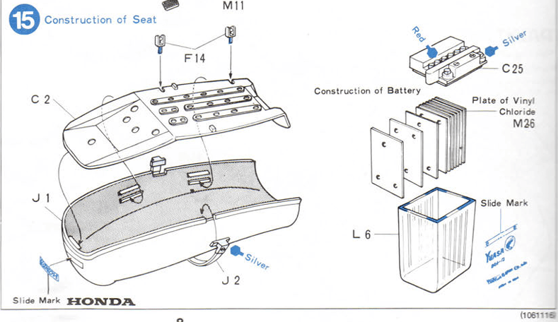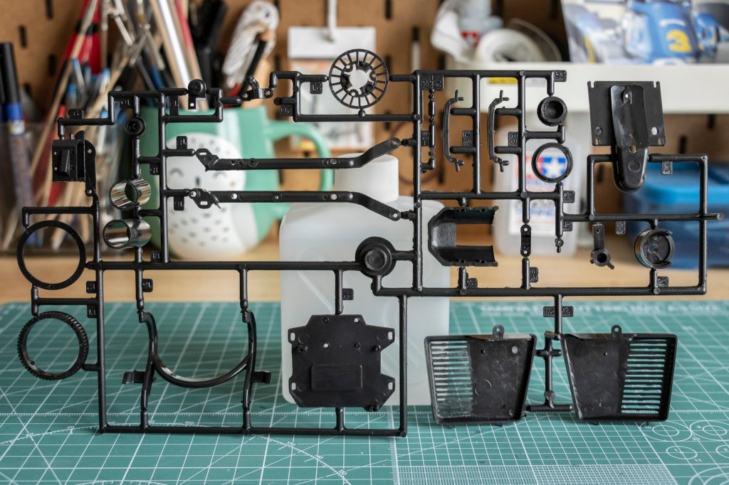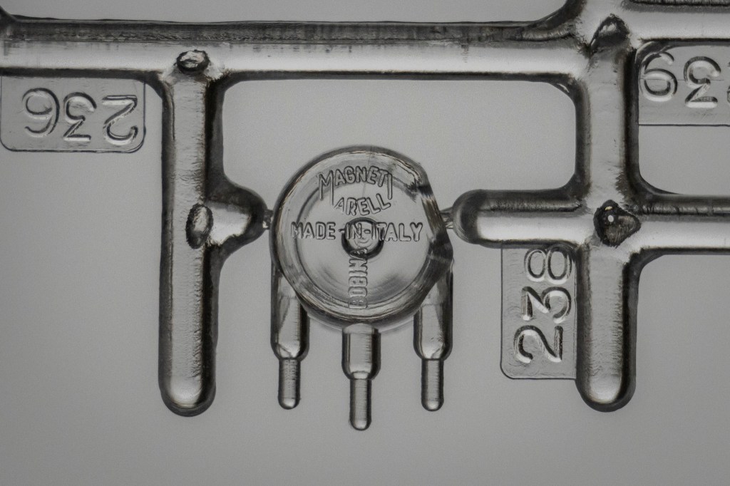 Look how complicated the battery assembly is! But since you’ve learned that the designer – Kazuo Okabe – who did something simialr in Tamiya’s first 1/6 big scale motorcycle, it’s no surprise that this kit carries the same level of intricate detail. Even the battery caps and terminals are moulded as spearate parts, showcasing how far Provini and Okabe went with the design.