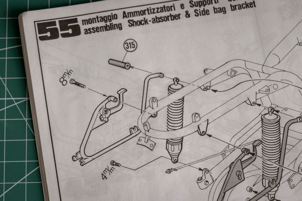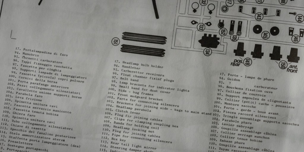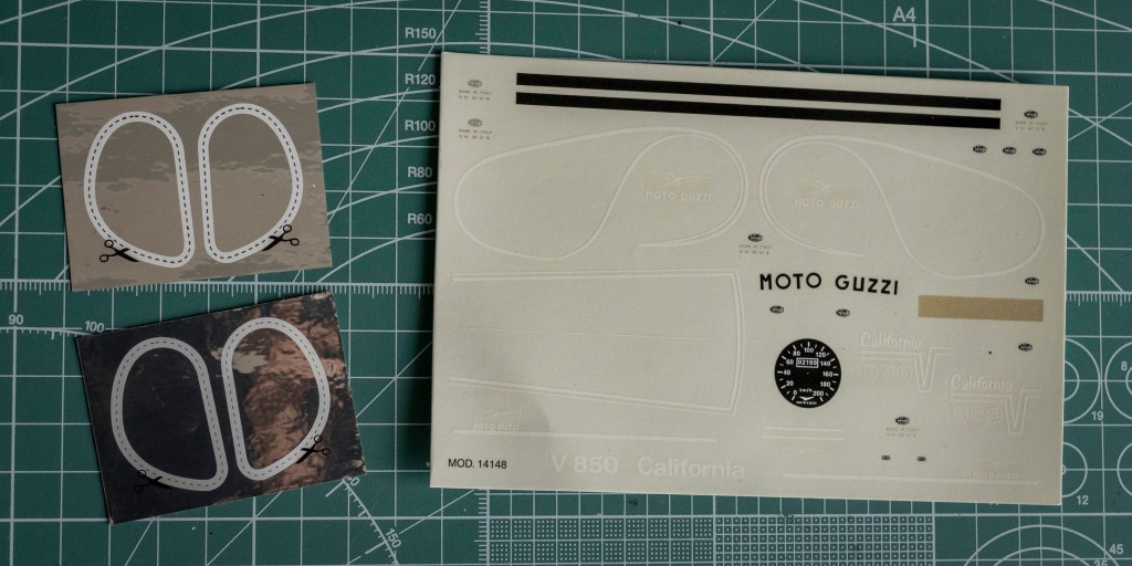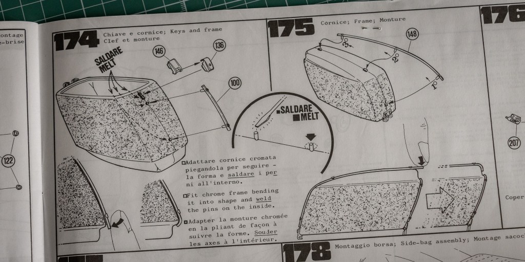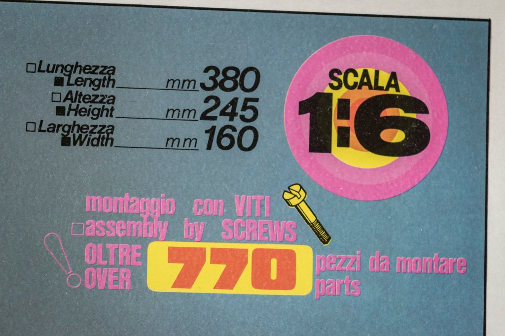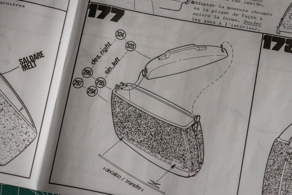 Not sure if this decal sheet was printed by Cartograf, but there is no visible yellowish after 20 years – a major problem when buying vintage kits. The same decal (different layout, of course) in Italeri’s 2013 re-release was printed by Zanchetti Buccinasco, a Milan-based printing company. Never heard of them before – interestingly, they have an unclaimed LinkedIn page. Also, not one, but two reflective sticker sets for the fuel tank are included, how considerate! You just know I’d mess one up, eh?
