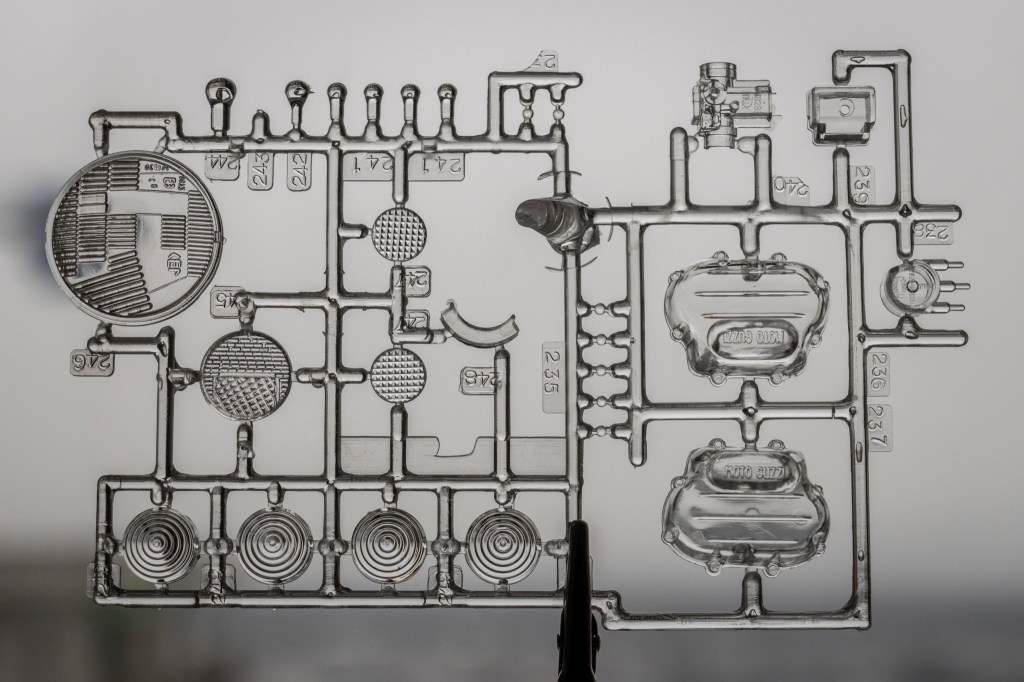 Okay – before you judge me, I’ll confess – I don’t have much experience with Protar’s kits, other than the abovementioned Lancia LC2. I’ve studied the sprues of their products, though, and I have seen many beautiful builds posted online. Though, this 1/6 V-850 seems a bit unrealistic to me…that came from Protar. But, if the man behind this big bike is the same person who designed the legendary 1/6 Honda CB750 Four at Tamiya – it all makes perfect sense now. All these, I tell you, has been such a learning process!