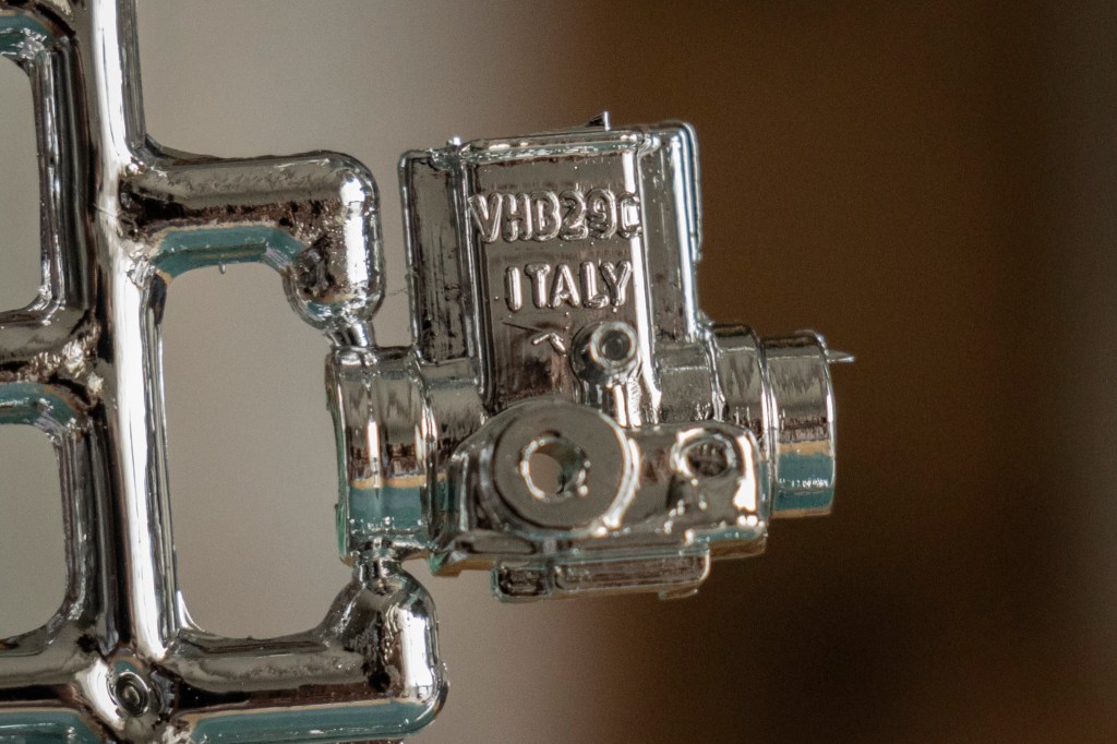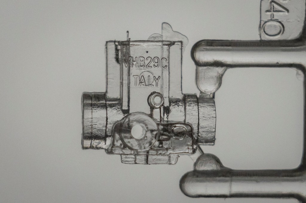 This kit includes one transparent carburettor and one chrome-plated carburettor. Either way, the chrome has to go. These carburettors were made by Dellorto, but I believe their logo was omitted due to copyright reasons.