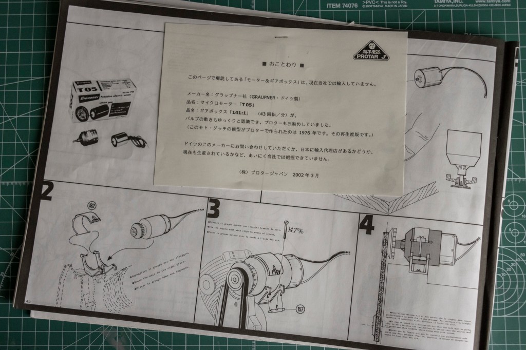 I have to start from where I got this kit. Yahoo auction! Not until I received the actual kit I learned that there was a “Protar Japan” in the past. This explains why I found this kit on a Japanese auction site. Interestingly, Protar Japan included an additional instruction manual with the kit, which I’ve shared here. The original Protar manual is printed in three languages: Italian, English, and French.