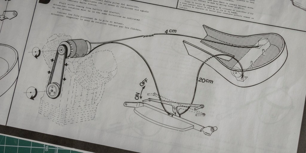 The brakes are operating complete with brake-shoes and return springs, that means, they are controlled by the articulated lever on the handle bar. Also the spedd handle control is operating, and by rotating it the carburettor valve is put into operating through a return spring. The clutch lever is operating, such as the brake lever, and when operated it connects and disconnects the wheelwork by its movement. Please note the perfect execution of the brake, clutch, accelerator cables, made up by an external sheath and a metal wrapping inside of which the control cable is placed. Owing to evident technical reasons the benzine feeding has been substituted by an electric motor and reduction gear (Graupner Micro T05 No. 1726/41 – No. 1726/141) (Reduction 41:1/141:1) which has to be mounted after having finished the model, on the place of the dynamo, so to allow the operating of the different parts (not qualified to help with Grammar here, but I did fix many spelling mistakes when typing)