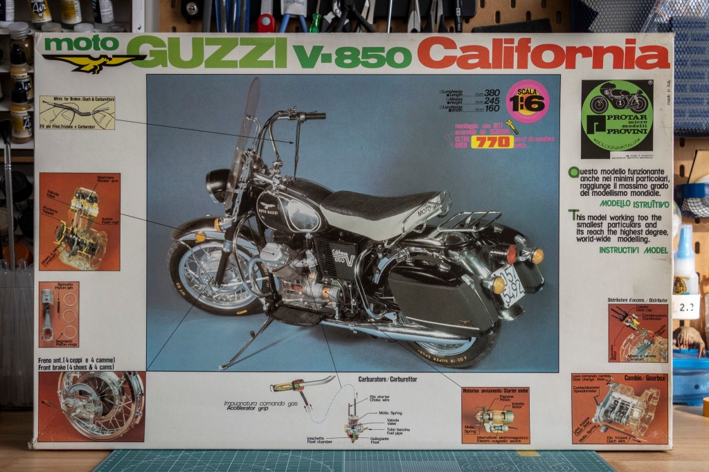 The flaws – wonky proportion, questionable fit, head-scratching or even speechless design – are submissive to Protar’s charm. Their 1/9 motorcycle series made it possible for those vintage and unqiue bikes to come back alive on modeler’s workbenches. Japan, for example – the country with the richest scale modelling culture – harbours a loyal Protar fan group. And while researching this Japanese fan group, I learned so much about the subject we are going to review today – the holy grail kit – 1/6 Moto Guzzi V-850 California.